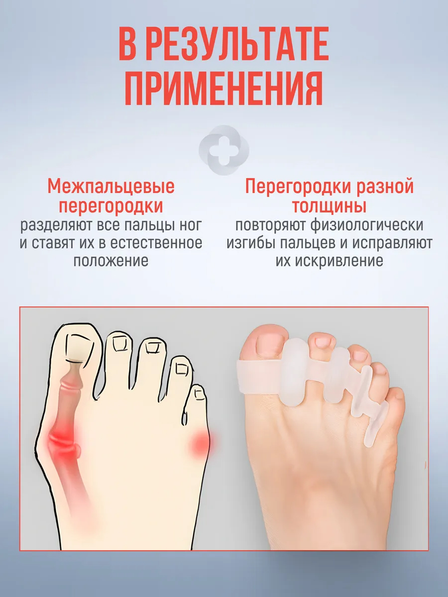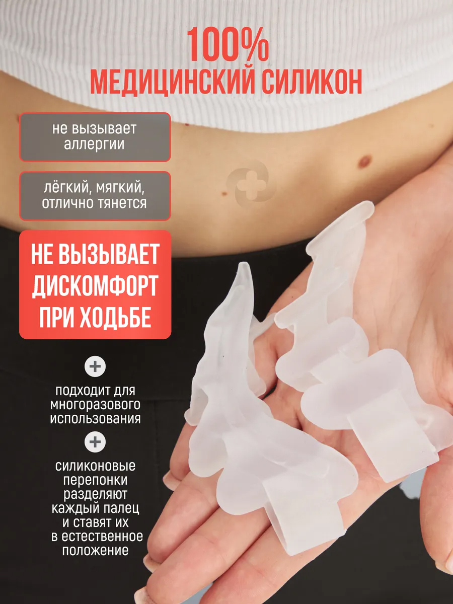 При регулярном ношении корректоры помогают избавиться от мозолей и натертостей. Силикон антизапах отводит лишнюю влагу и предотвращает потение ног, что снижает риск появления опрелостей. Результатом использования разделителей будет выравнивание неправильного положения пальцев ног и профилактика грибка. Эти бурсопротекторы рекомендованы врачами подологами и подходят для мужской, женской и детской обуви.