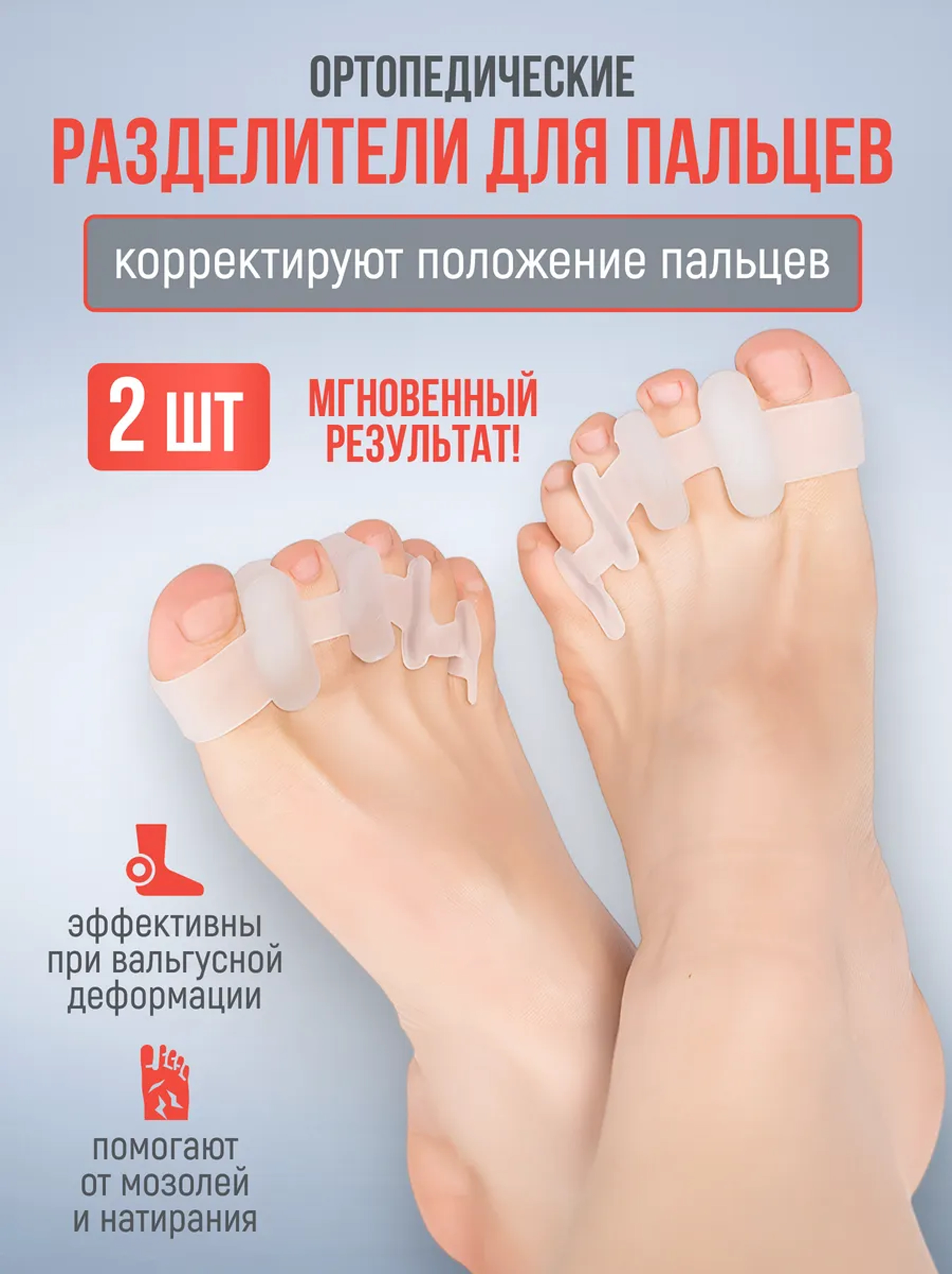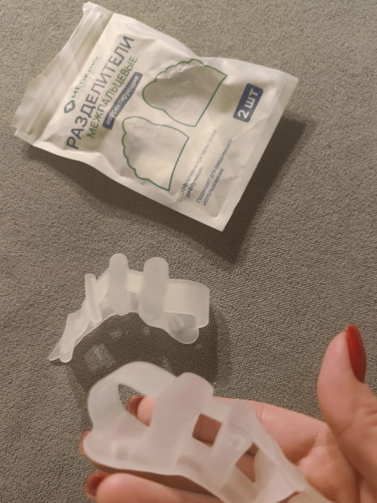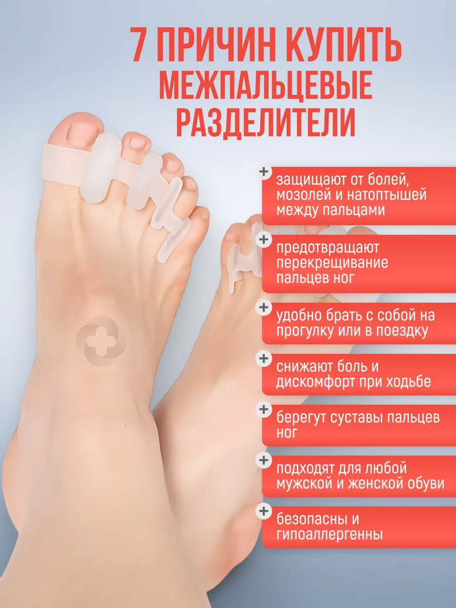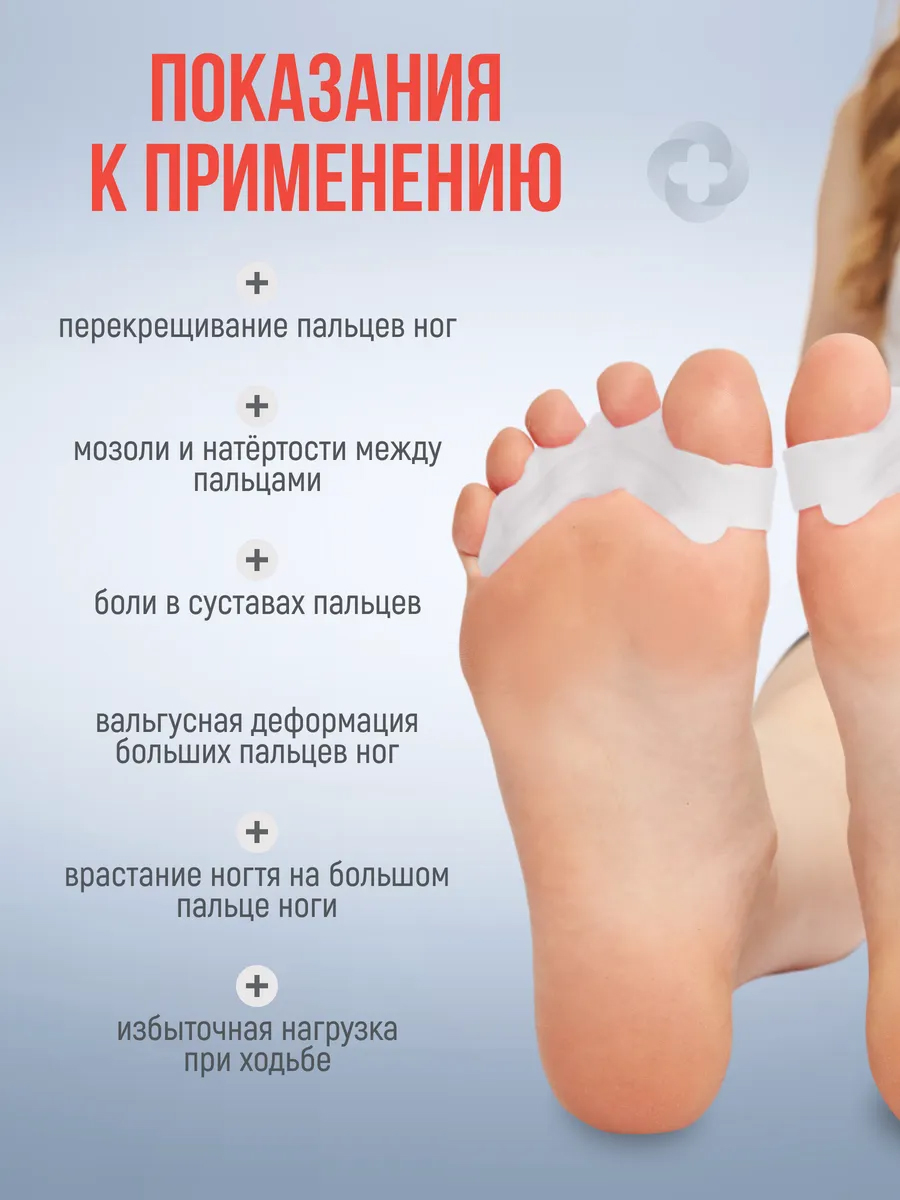 Медицинское изделие имеет универсальный размер и доступно в трех различных оттенках: белом, голубом и розовом. Разделители помогают при лечении вальгусной деформации, молоткообразного изменения стопы и снимают боль в суставах. Они защищают от дискомфорта при вросшем ногте и снижают нагрузку на позвоночник и суставы во время ходьбы, бега и занятий спортом.
